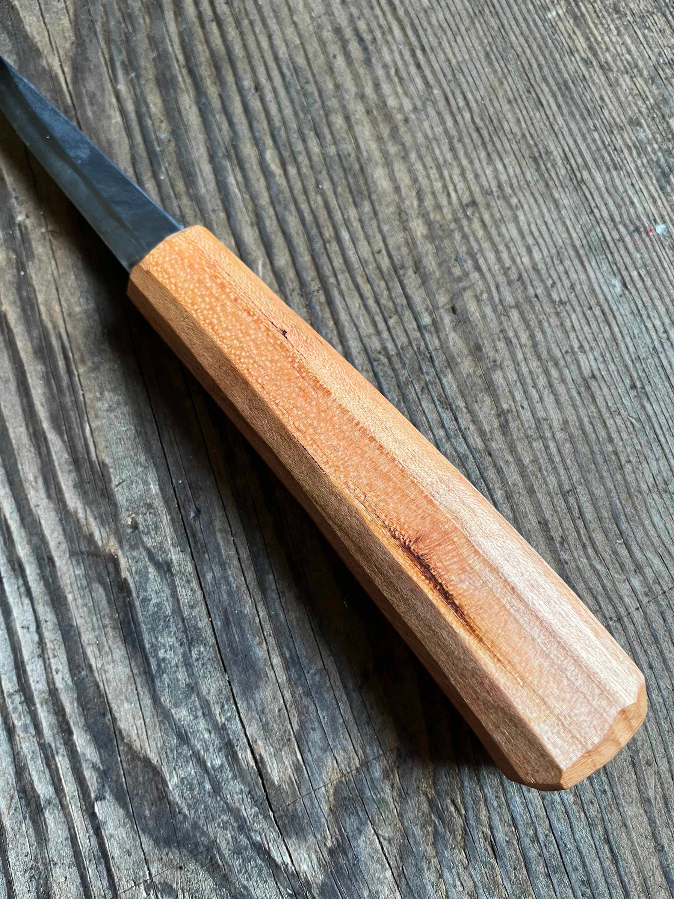Here is a carving knife consisting of a Mora106 blade with a hand carved handle. In my eight years as a spoon carver, I have had lots of sloyd knives over that time. I carved many spoons with the “off the shelf” mass produced knives made by Mora (sometimes Morakniv). The Mora 106 sloyd is the industry’s best knife, produced by a company that has been making knives for generations. I have since progressed to buying hand forged knives, or making my own from purchased blades. As a result, I have many Mora 106 sloyd knives that are lightly used. I am refurbishing the blades and replacing the old handles with new, hand carved handles.
